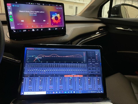In deze Skoda Enyaq IV heeft CaraudioBV haar SKO-DSP-4 audio upgrade pakket gemonteerd. De originele tweeters in A-stijlen en de midbas speakers in de voorportieren zijn vervangen. Voor een diepe basklank is er in de kofferruimte een subwooferbehuizing geplaatst. Een meerkanaals versterker met ingebouwde DSP stuurt de speakers aan.
