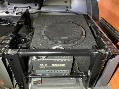De Audison subwoofer onder de bijrijdersstoel.