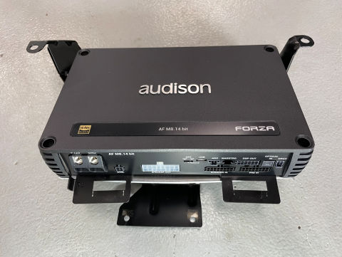 De Audison versterker op de originele bevestigingsplaat van de Porsche.
