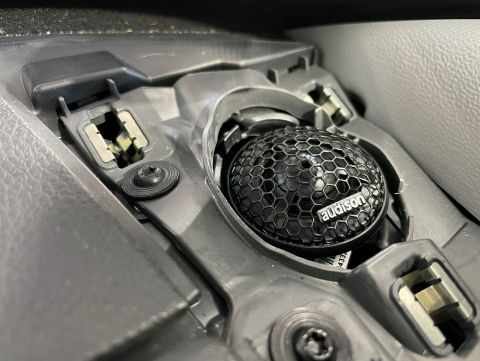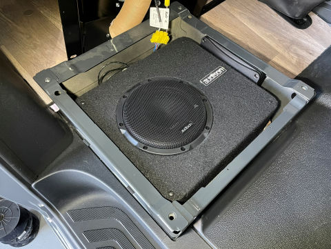 Audison subwooferbehuizing onder de bijrijdersstoel.